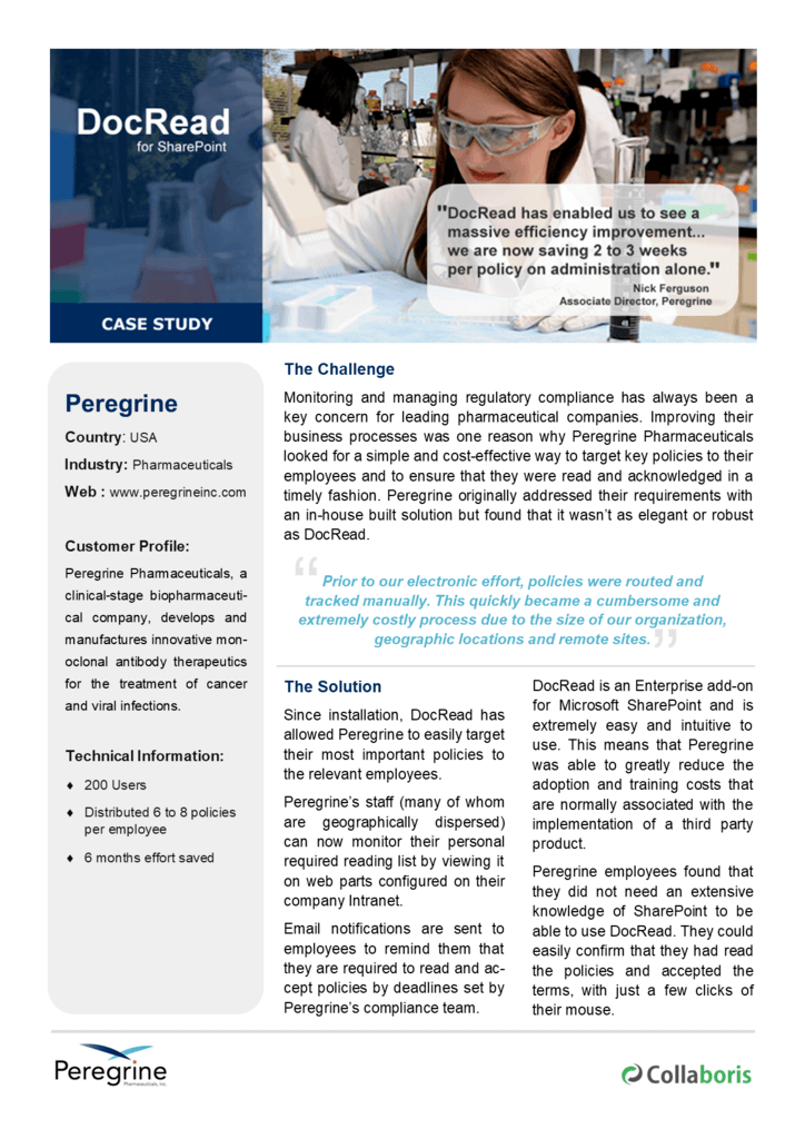 DocRead has transformed the way we do internal policies. Gone was the word document on our website requiring email confirmations to be replaced by a fully automated solution where our employee’s login to our DocRead SharePoint site and perform the read and signature confirmation right there! Administration of DocRead is also very easy and getting tech support from Collaboris is always quick and efficient. I highly recommend DocRead.