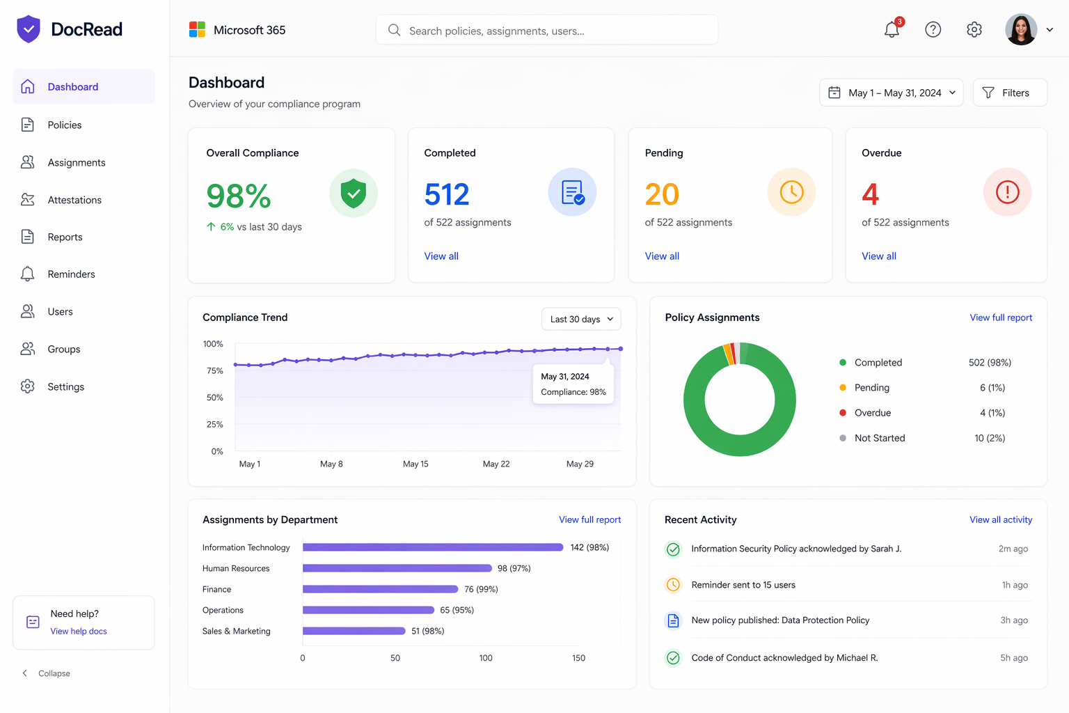 Yes. DocRead integrates with Microsoft Entra ID (Azure AD) and SharePoint groups. You can target policies to specific audiences, ensuring the right information reaches the right people without cluttering the feeds of irrelevant departments.