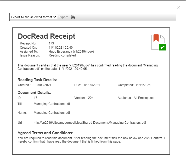 DocRead will generate a positive reading receipt when a reading task is completed. This confirms which version of a document was read, at what time and by whom. Administrators can also use the receipts for auditing purposes. Users can access their reading receipts at any time or even download them as pdf documents.