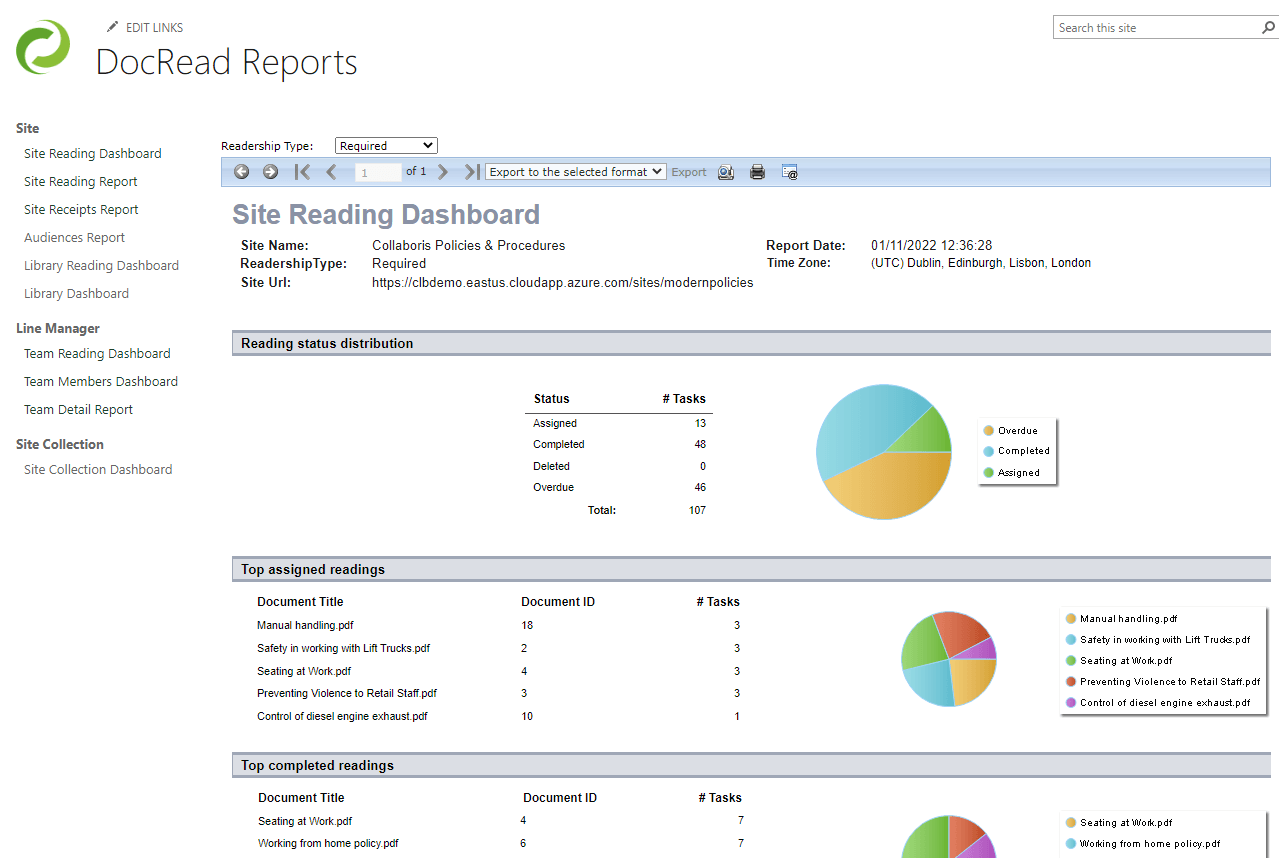DocRead's reporting suite summarizes the reading statuses of all tasks at different levels so you can find exactly what you need. Drill down options allow you to move from Site reports to library and individual policy or user level reports. These are updated as soon as someone completes a task so you can be sure you are looking at the latest information.